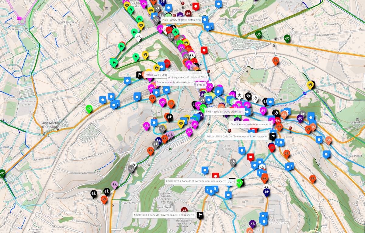 L’association propose depuis 2017 une carte diagnostique des aménagements piéton et vélo en pays de Morlaix (limité principalement aux communes de Morlaix et Plourin-lès-Morlaix).